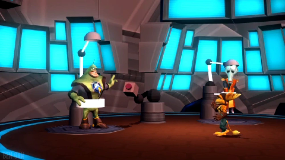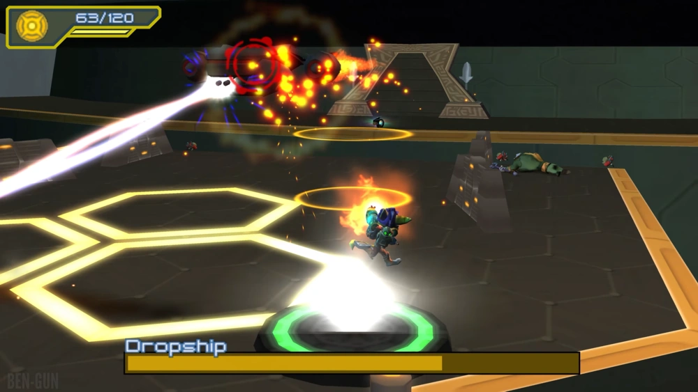 La cosa es que justo conforme terminamos de dar la vuelta, aparece escondido escuchando a escondidas (valga la redundancia) Qwark, quién anda en búsqueda de más aventuras y al que también le ha dado una crisis existencial por no conocer a sus padres. En todo el caos estúpido, una nave se acerca al suelo y unos cuantos mercenarios robots bajan del suelo y agarran a Luna (la niña) y se piran. Que nos roben a una niña delante no es que quede muy bien en el currículum de héroe, así que perseguimos a la nave derrotando mercenarios hasta que justo justo se nos escapan por los pelos.