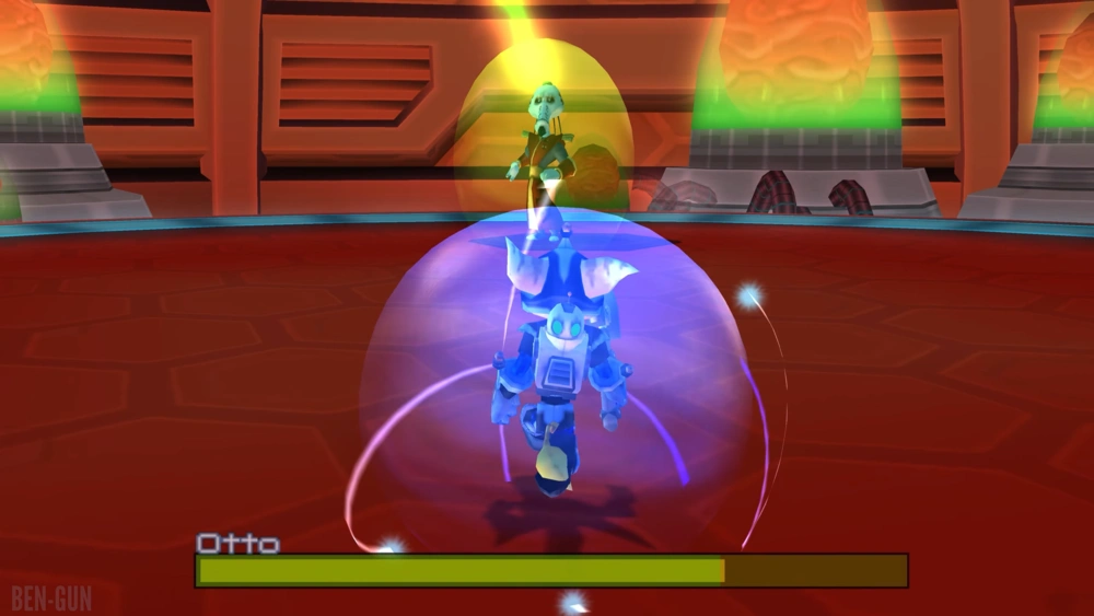 Cuando le explicamos dos cositas al tontopolla este, se le bajan dos tonitos y se mete en otra arena ya listos para el combate final. Recargamos munición y entramos a la velada del año, Ratchet y Clank contra el emperador Otto. Dicen las malas lenguas que este año ha sido el streamer que más ha ligado con menores y defraudado a hacienda, y el gobierno ha enviado a Ratchet para ponerle fin. Tenemos delante nuestra una batalla de comer munición como unos posesos porque tiene un escudo que vamos desactivando por daño.