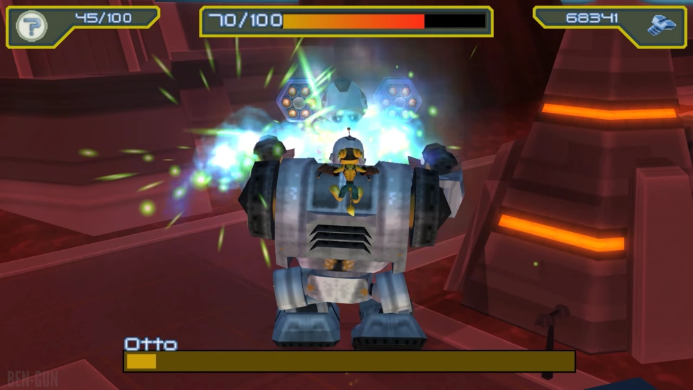 A Otto se le inflan los cojones de lo absurdamente difíciles de matar que somos, así que nos roba el rayo encogedor y se desencoge un poquito para parecer gigante y aplastarnos. La cosa es que conseguimos ponernos a salvo, pero conseguimos huir a campo abierto. Ahí el se hace aun más grande, pero gracias a una convenientemente posicionada plataforma de Clank gigante, pasamos a puñetazo limpio.