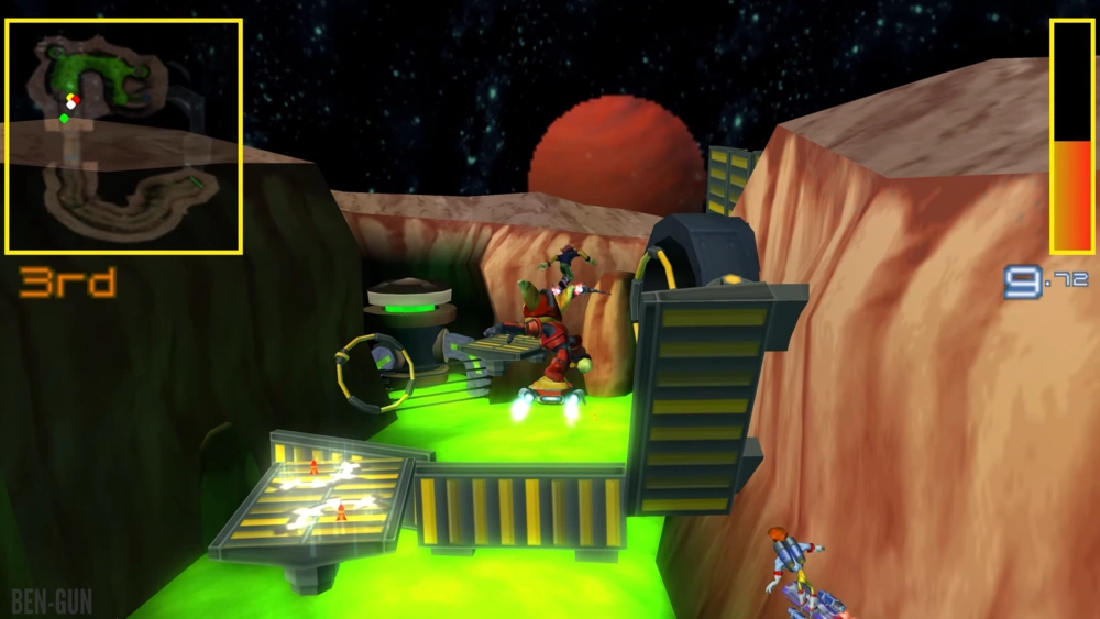 Se que los otros juegos siguen teniendo una composición así, pero lo de este es infumable. No solo no es interesante lo que estás viendo con los planetas, sino que tampoco te invita nada a explorar, es solo ponerte visión de túnel y hasta que se acaba el nivel. Y eso me entristece, la verdad. También está eso de que estás solo en la galaxia salvo por el puto drogas de las carreras de tablas, las cuales voy a aprovechar aquí para criticar.